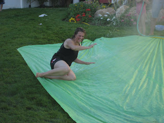 We had a minor set back when we told the kids that we would go swimming, forgetting that all the pools are closed to children 5 and under. We were dressed in our swimming suits and ready to party before we remembered so they were pretty let down. We headed home for a neighborhood dinner. We didn't remember that there was going to be slip n sliding involved so that cheered the kids right up!